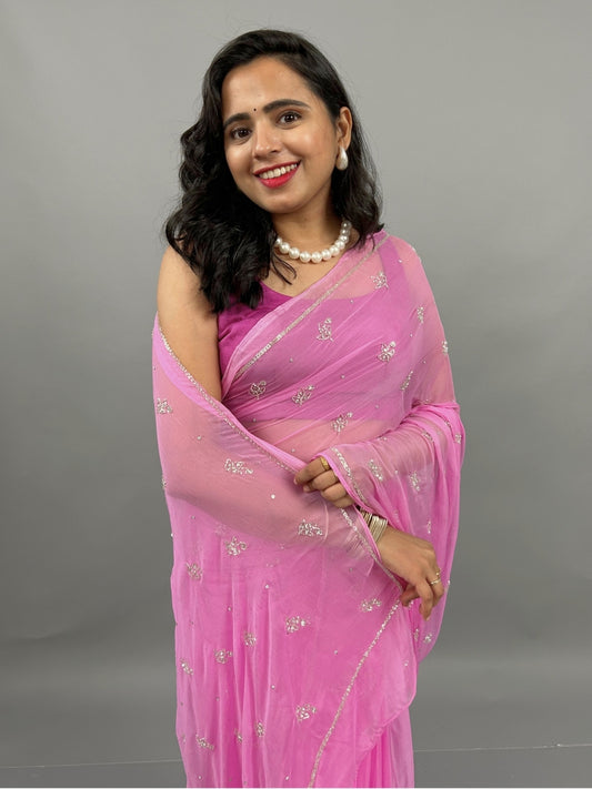 Beautiful dreamy lavender saree for young women. Softest pastel shade of purple adorned with handpainted, cutdana and sequins work.
