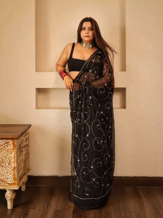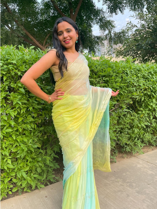 Get heads turning with stunning yellow chiffon sarees with finest hand embroidery....