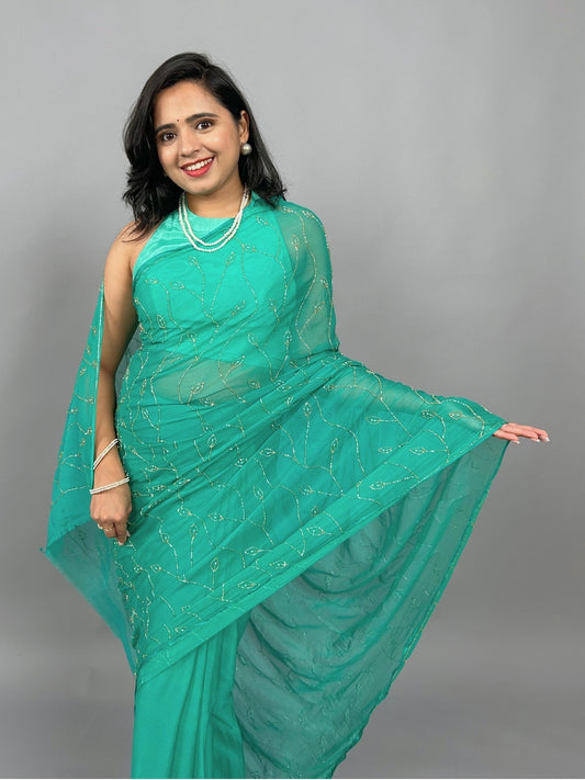 Designer green chiffon saree online with fine hand-embroidery and hand-painted sarees, perfect...