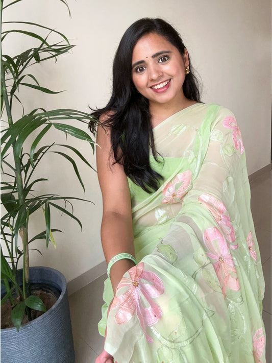 Designer green chiffon saree online with fine hand-embroidery and hand-painted sarees, perfect...
