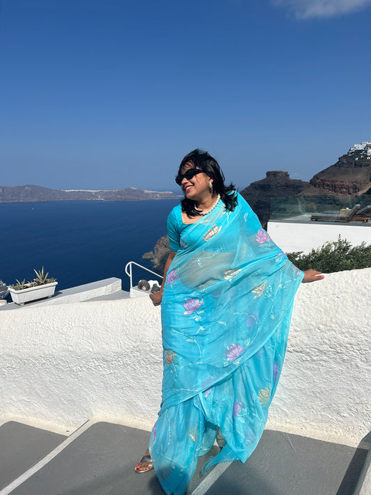 This stunning hand-painted saree having pearl paint with aari work embroidery is a treat to the senses