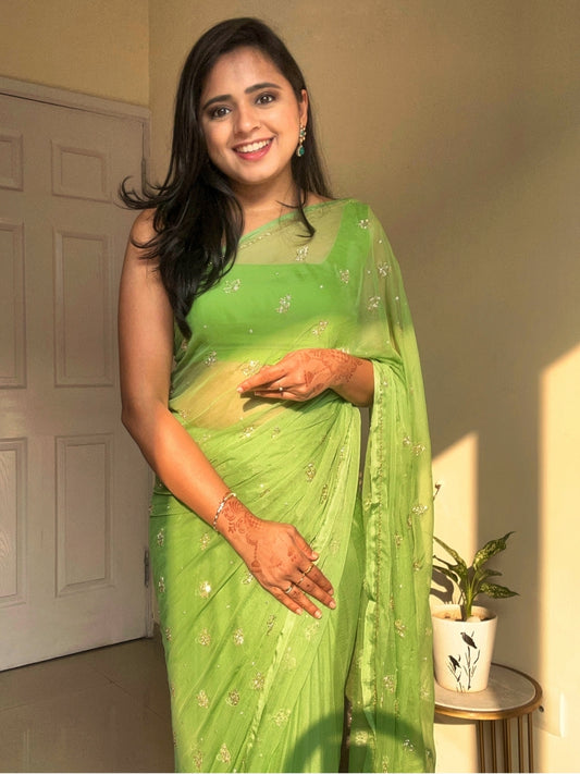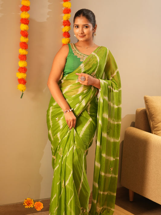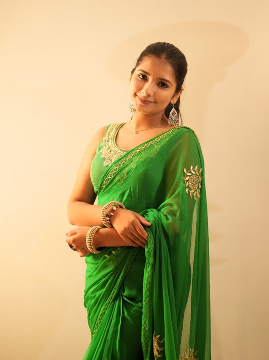 Designer green chiffon saree online with fine hand-embroidery and hand-painted sarees, perfect...
