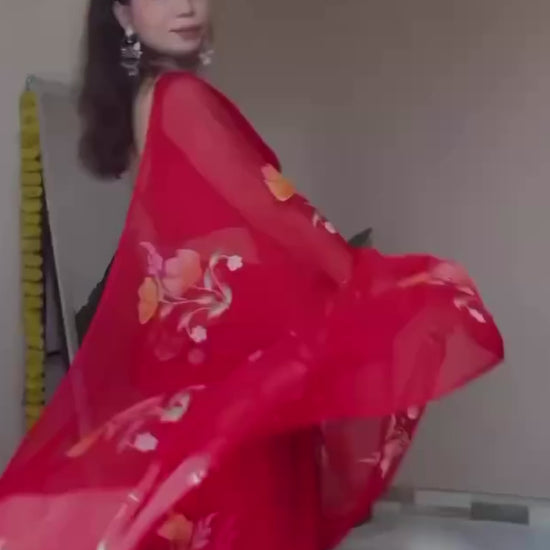 Festive perfect red handpainted chiffon saree with bouquet of flowers 💐